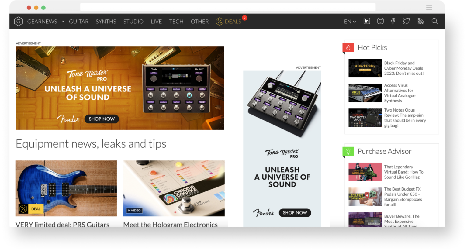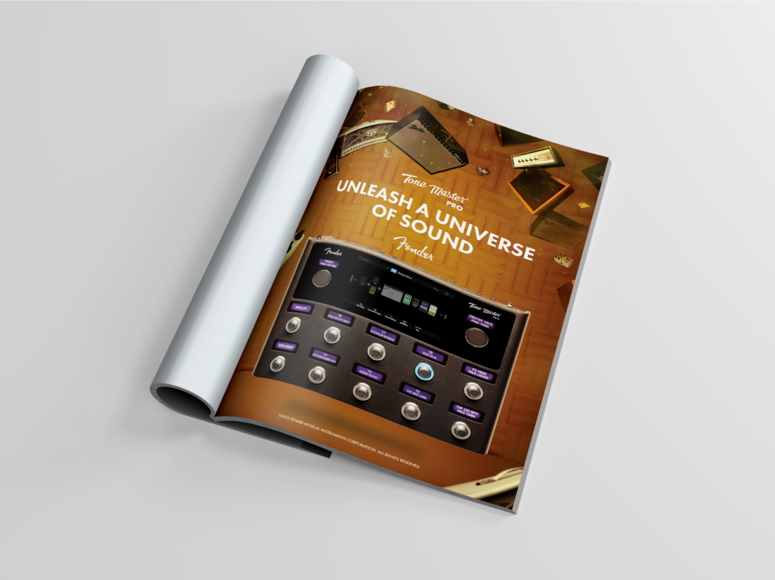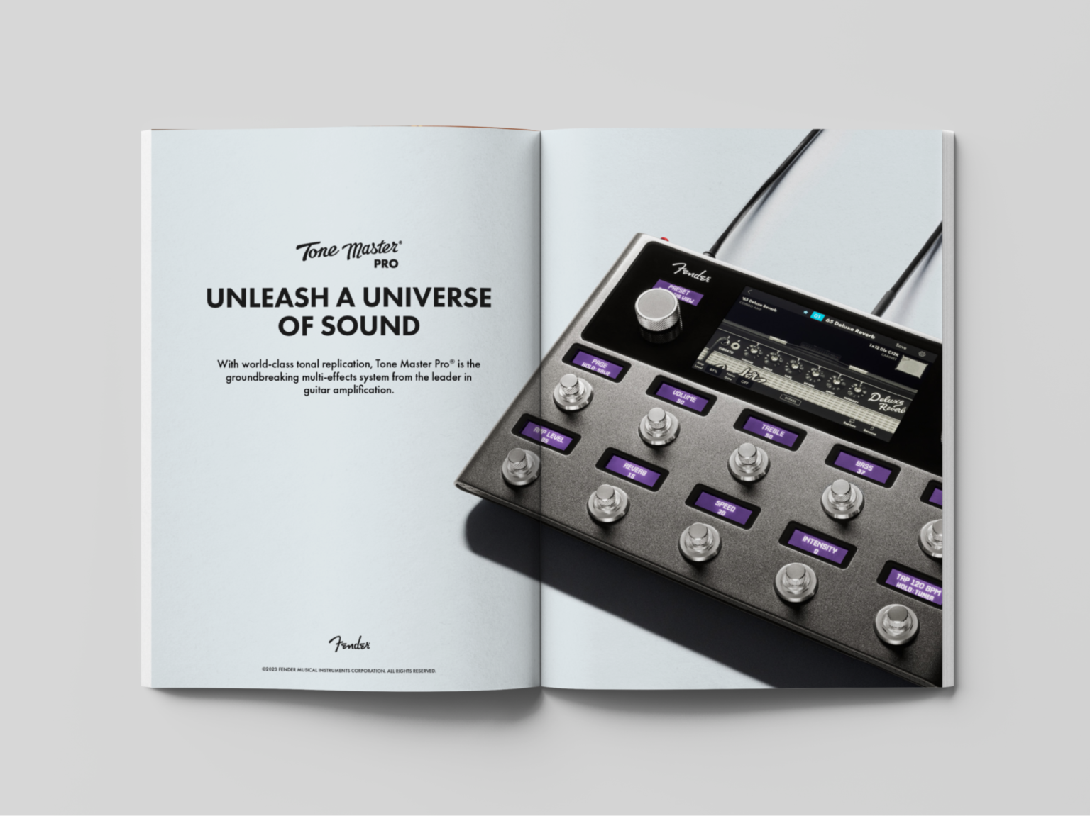 Fender approached our team with a bold mission: to introduce the Tone Master Pro, their first venture into the digital effects modeler arena. Anticipating a degree of skepticism within the guitar player community toward the first-ever device promising an authentic replication of the iconic Fender tube amplifier sound, we knew we had to craft a compelling narrative. Our creative strategy focused on forging a deep connection between the Tone Master Pro and the storied lineage of Fender amplifiers and effects pedals that have cemented the brand's legendary status. At the heart of the campaign was a dynamic showcase featuring Dan Geraghty, touring guitarist for Twenty One Pilots. Through his explosive demonstration, we highlighted the extensive palette of effects accessible with the Tone Master Pro. As the senior designer, I spearheaded the initial creative direction, shaping the vision that materialized in the hero video and key art design. From conceptualization to final designed creative, I was intimately involved in every facet of the creative execution.